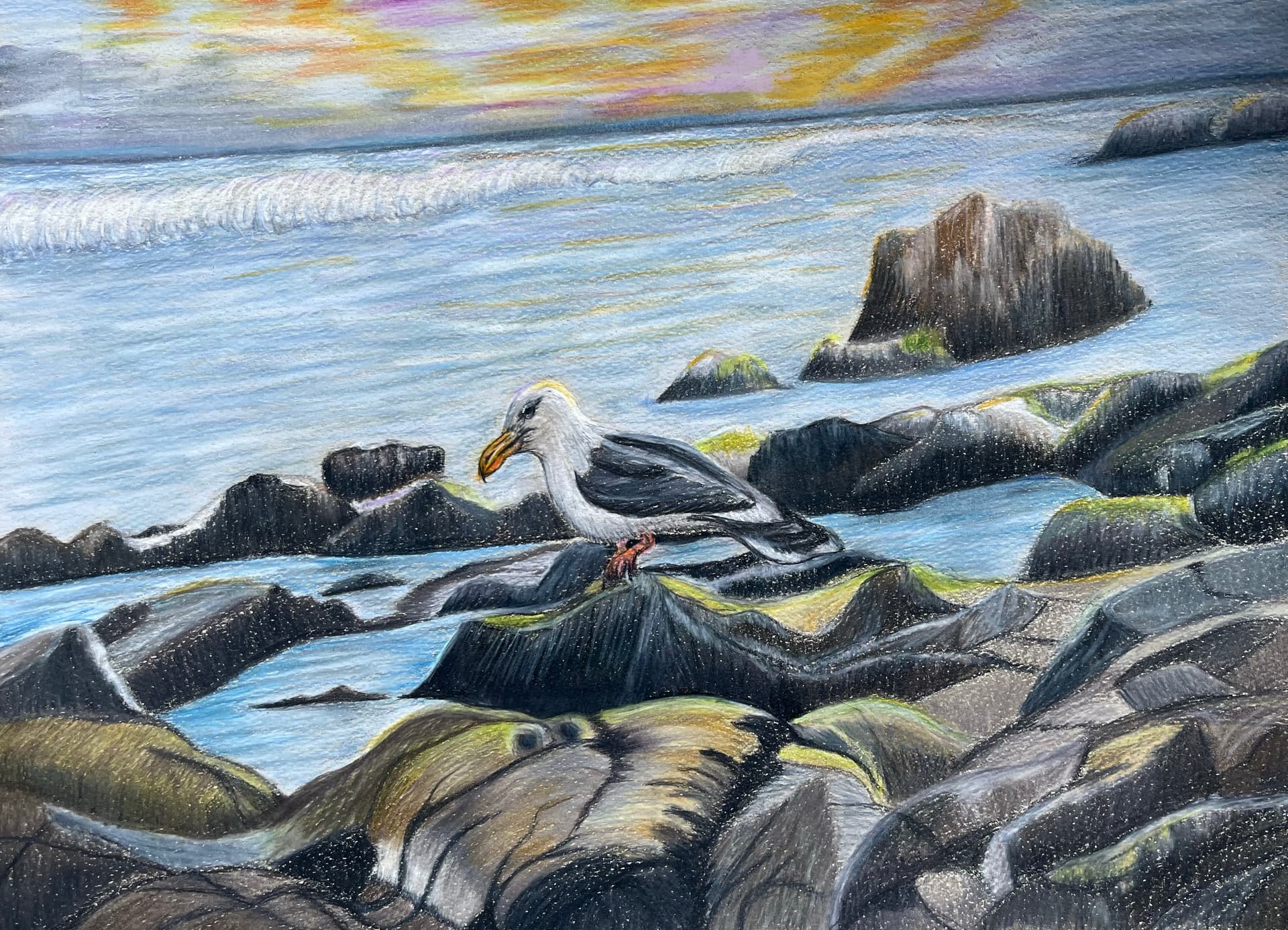 The skill on this thread is daunting- but here is what I’m working on. It’s been challenging to make the rocks look like rocks. I don’t consider any part completed yet. This is colored pencils on pastel paper from Strathmore, toned beige. My photo reference is from Pixabay.