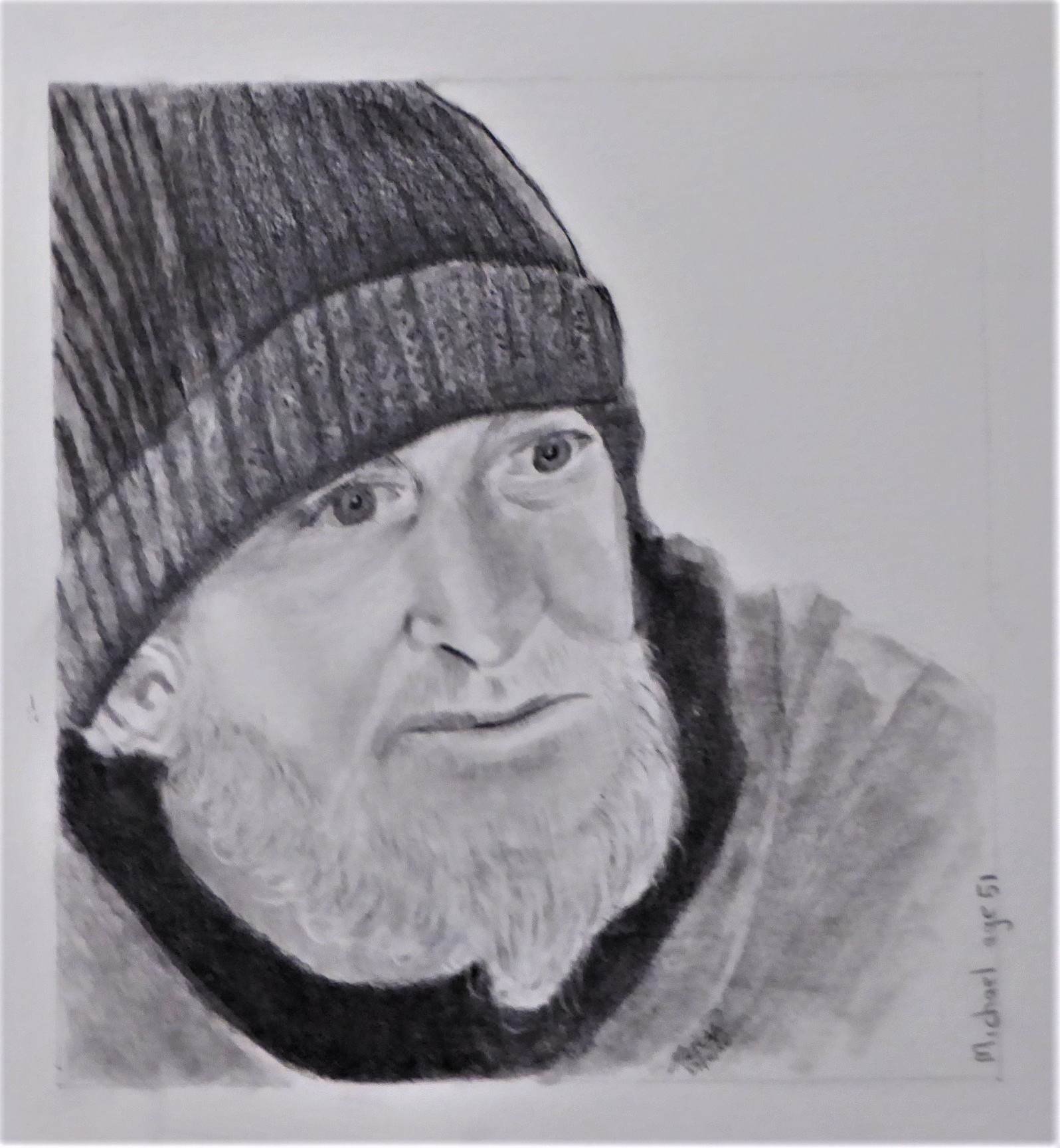I have a little project to record the stories of the Street People I meet. This is my first candidate. I have completed 2, though the second is not photographed. The 3rd is stuck on representing a Staffordshire Terrier’s short grey fur using graphite on white paper. Graphite on 300gsm!